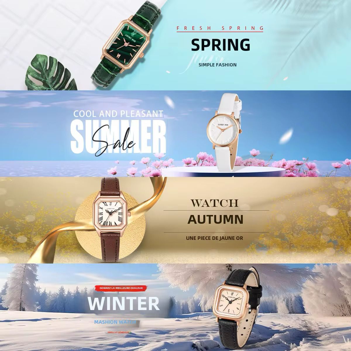 Ce produit est un élégant coffret cadeau de la marque Lucky Fox, comprenant quatre montres différentes inspirées des quatre saisons : printemps, été, automne et hiver. Chaque montre présente un design unique en termes de forme de boîtier (rectangulaire, ronde, carrée), de couleur de cadran et de bracelet (vert, blanc, marron, noir), avec des finitions dorées ou doré rose pour les boîtiers. Les bracelets sont fins et semblent être en cuir ou imitation cuir, avec des fermoirs à boucle ardillon. L'ensemble est présenté dans un coffret cadeau bordeaux portant le logo Lucky Fox. Ce coffret est idéal pour ceux qui aiment varier leur style en fonction des saisons ou comme un cadeau original et raffiné.